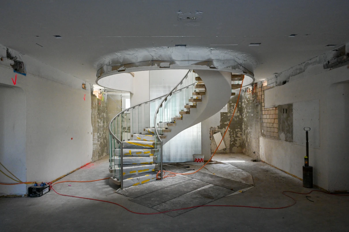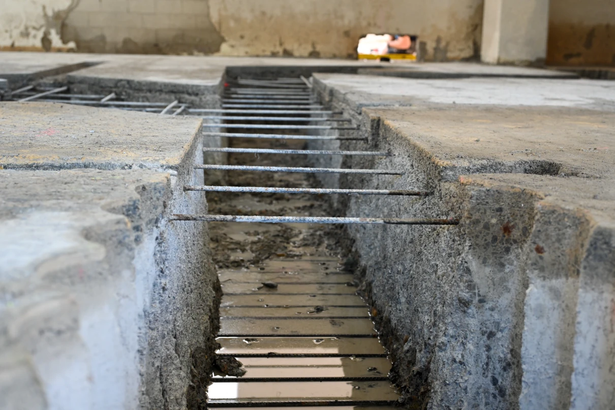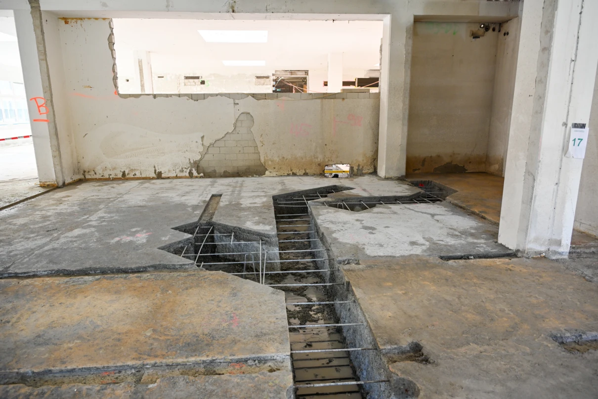 Unser Leistungsumfang umfasst das Erstellen von Bodenschlitzen in der bis zu 60 cm starken Bodenplatte mittels Hochdruckwasserstrahltechnik (HDW), diverse Maurerarbeiten sowie statische Verstärkungen durch den Einbau vorfabrizierter Beton- und Stahlstützen. Zusätzlich führen wir die Ortbetonarbeiten für die neuen Liftschächte aus.