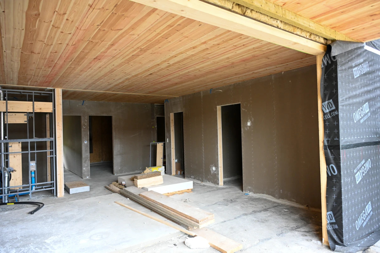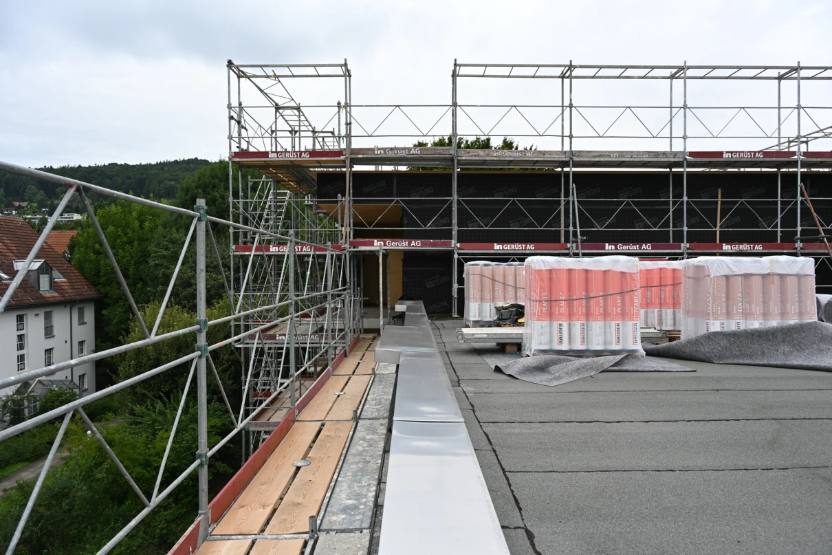 Das Haus Nr. 39 wird zusätzlich in Holzbauweise um ein Geschoss aufgestockt. Für diesen Bauteil übernehmen wir neben den genannten Arbeiten auch die erforderlichen statischen Verstärkungen sowie die Fräsarbeiten für die Erhöhung des Treppenhauses.